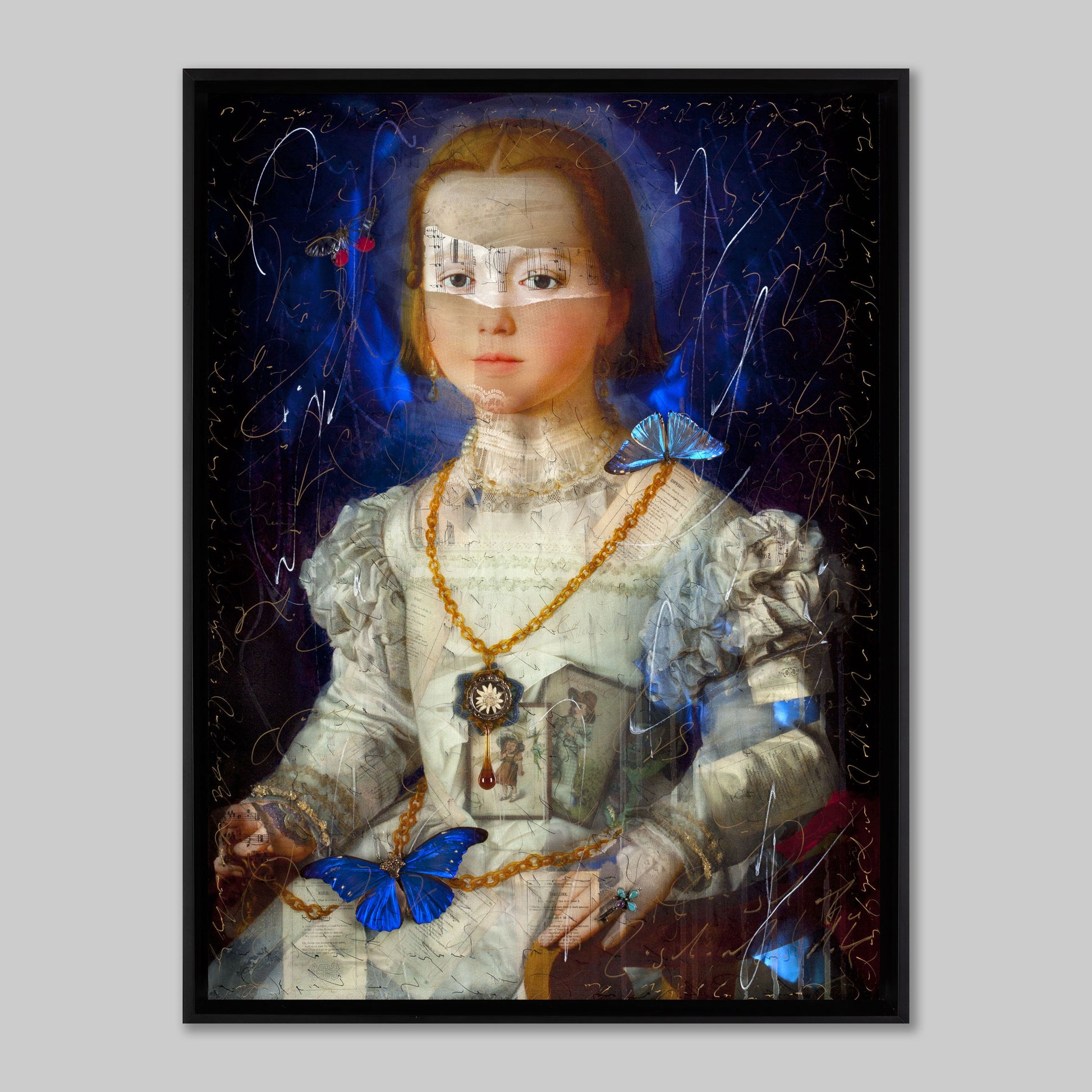Bianca de' Medici was the illegitimate daughter of Cosimo de' Medici who died young. This piece celebrates her beauty and childhood memories, with butterflies, antique objects and story books. The brilliant blue glows in innocence and beauty.