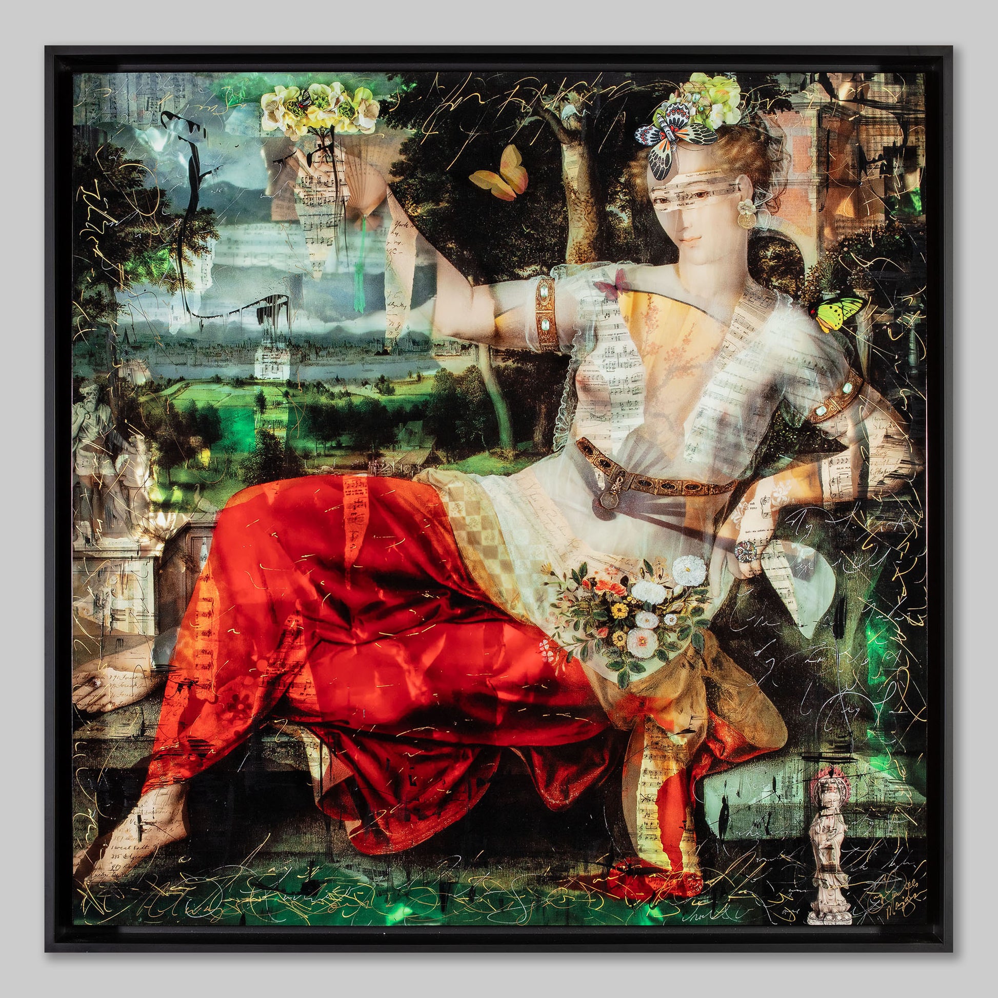 La Boheme is based on the Opera by Puccini. It is a story about bohemian artists and their love of art and freedom. The beautiful central figure is lifting a bouquet of flowers in salute to art and artist.