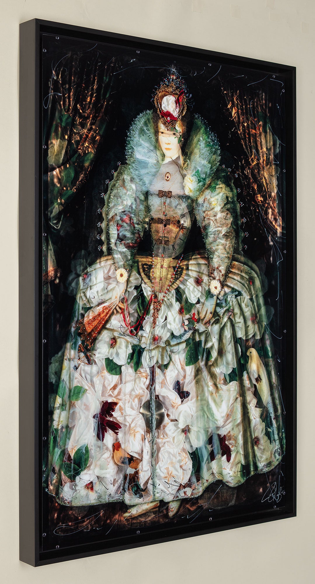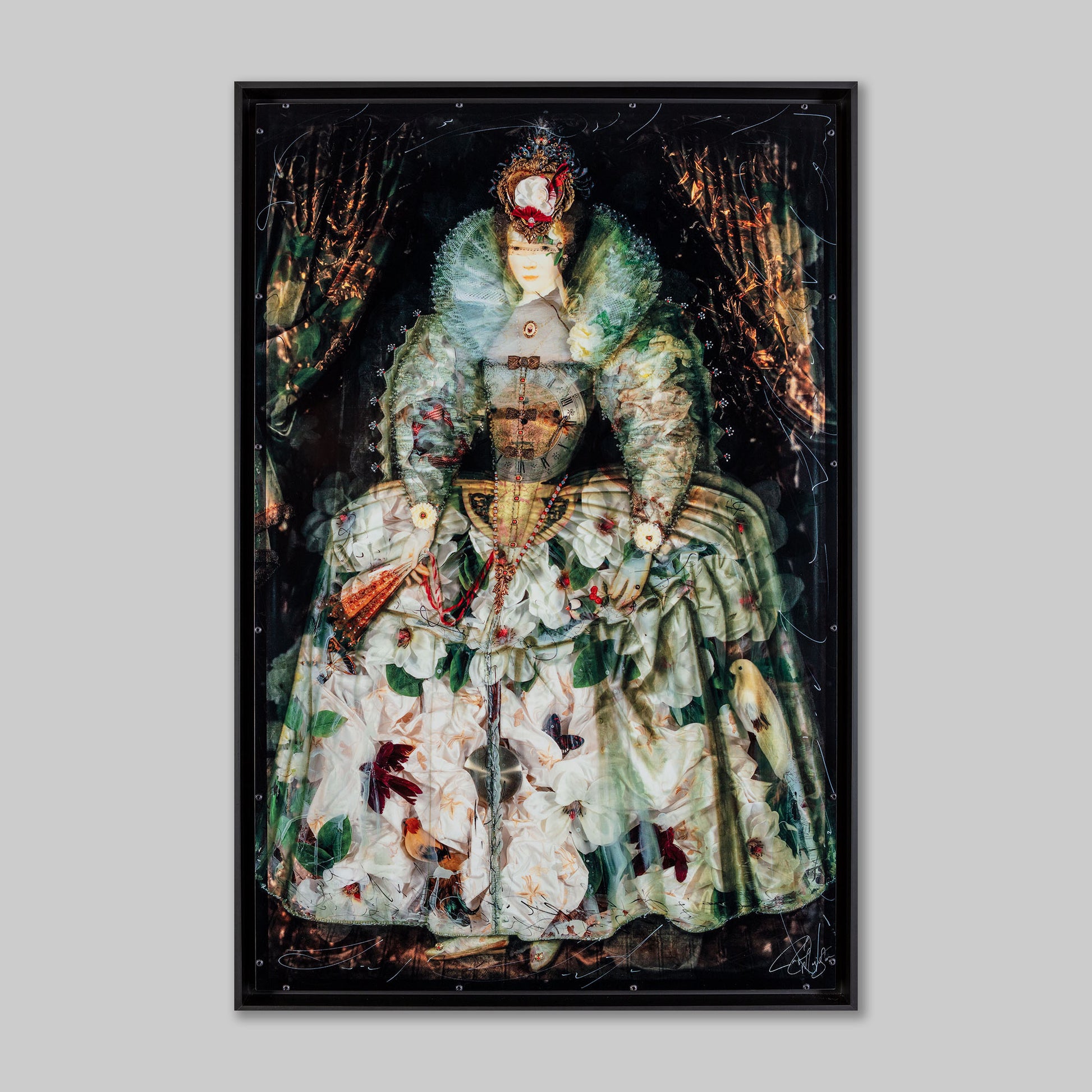 Lady Blossom is literally made of flowers. As you look into the image you can see that her dress is not flat at all, but a collage of fabrics, flowers, birds and other objects. At her chest, you see the face of an antique clock. Time is a reoccurring theme in Ingrid's work - representing the infinite beauty of our spirits. This noble young woman, who lived hundreds of years ago, is brought back to life in Ingrid's work.